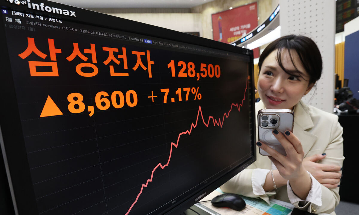 코스피가 새해 첫 거래일에 4300선을 돌파하며 사상 최고치를 경신한 2일 서울 여의도 한국거래소 모니터에 삼성전자 주가가 표시되고 있다. 삼성전자는 전일 대비 7.17% 오른 12만8500원에 마감하며 신고가를 경신했다. 뉴스1 ◆증시 부양책·반도체 호황에 추가상승 기대