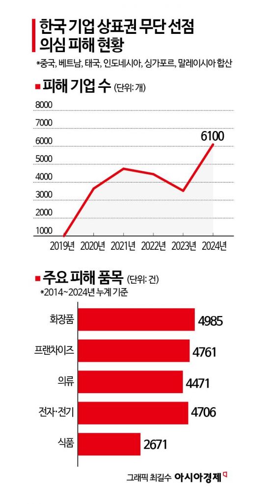 피해 기업들도 증가하고 있다. 한국지식재산보호원에 따르면 주요 국가(중국·베트남·태국 등 6개국)에서 상표권 무단 선점 의심 피해 기업은 2019년 1001개에서 지난해 6100개로 5년 새 6배가량 늘어난 것으로 집계됐다.