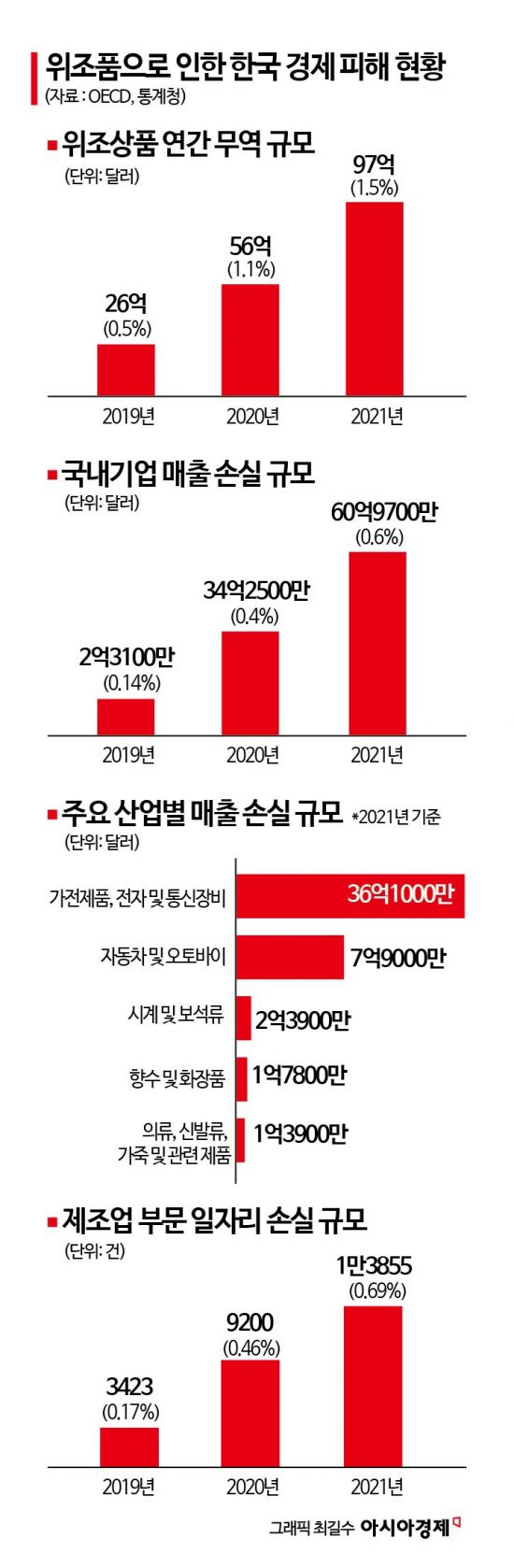 일자리 손실 규모는 약 1만3800개로 제조업 임금근로자(2021년 기준)의 약 1%(0.7%)가 위조품으로 인해 피해를 본 것으로 나타났다. 국내 기업 기준 국민은행 임직원(1만3800명) 전체가 사라진 것과 같다. 국가적 손실도 적지 않다. OECD가 집계한 세수 손실은 1조7150억원에 육박한다.