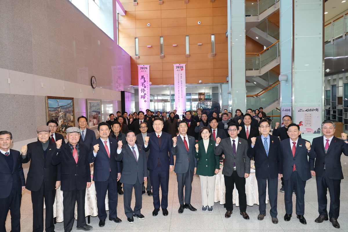 포항시의회는 병오년 새해를 맞아 2일 오전 시의회 1층 로비에서 신년인사회를 개최한 가운데 기념촬영을 하고 있다. 포항시의회 제공 이날 신년인사회에는 김일만 의장을 비롯한 시의원, 이강덕 시장과 서재원 정무특보 등 시청 간부 공무원, 김정재?이상휘 국회의원, 경북도의회 이동업·연규식·서석영·손희권·이칠구 도의원, 공원식 포항지역발전협의회장, 진병수·박태식·이상구·문명호 전 시의회 의장, 한명희 의정회장, 이두우·강한국·김경춘·이순동 전 의원을 비롯한 전직 시의원 등 총 100명이 참석했다. 의원들과 내빈들은 새해 덕담을 나누고 의정 철학을 담은 ‘마부정제(馬不停蹄 : 달리는 말은 말굽을 멈추지 않는다)’가 새겨진 시루떡을 자르며, 2026년 포항시의회 의정 운영 방향과 비전을 공유했다.