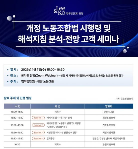 광장은 오는 7일 오후 3시부터 웨비나 형식으로 '개정노동조합법 시행령 및 해석지침 분석·전망 고객 세미나'를 개최한다고 5일 밝혔다.