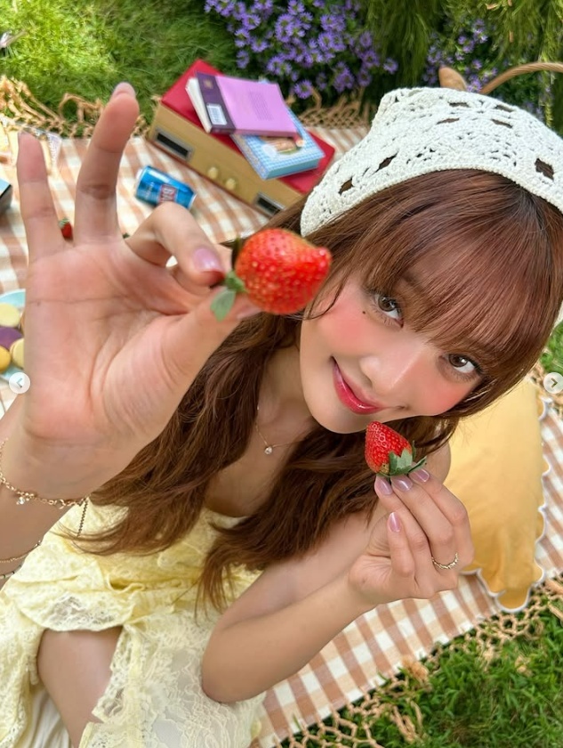 특히 딸기를 손에 든 채 카메라를 향해 미소 짓는 모습이 눈길을 끈다. 맑은 피부와 은은한 메이크업, 긴 웨이브 헤어가 어우러지며 동화 같은 장면을 연출했다.