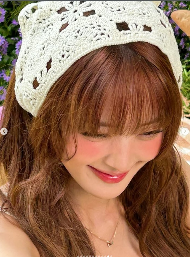 사진 속 민니는 초록빛 정원이 펼쳐진 야외 공간에서 피크닉을 즐기고 있는 모습이다. 레이스 디테일이 돋보이는 옐로 톤 원피스에 니트 헤어밴드를 매치해 한층 화사하고 부드러운 분위기를 완성했다.