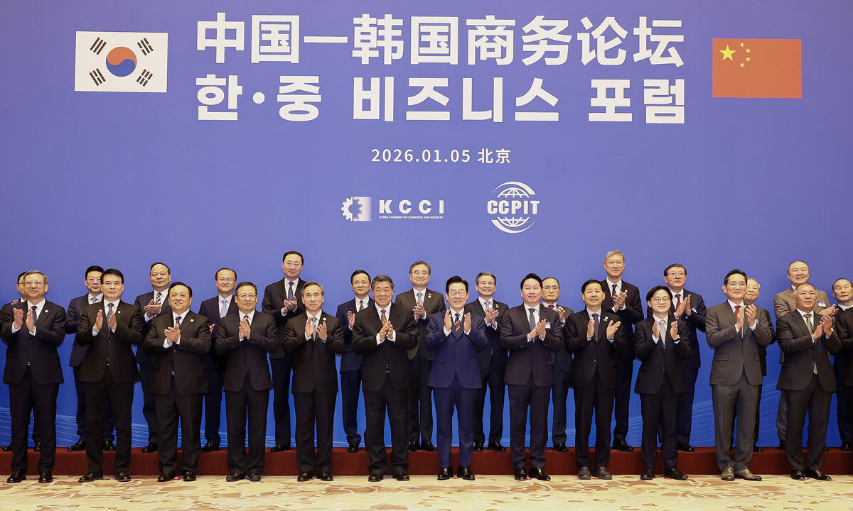 韓·中 기업인 한자리에 중국을 국빈 방문한 이재명 대통령이 5일 베이징 댜오위타이(釣魚臺·조어대)에서 열린 한·중 비즈니스 포럼 사전 간담회에서 참석자들과 박수를 치며 기념촬영하고 있다. 이날 포럼에는 한국 측 400여명과 중국 측 200여명 등 총 600여명의 기업인이 참석했다. 가운데 자리한 이 대통령을 중심으로 왼쪽은 허리펑 중국 국무원 부총리, 오른쪽은 최태원 SK그룹 회장. 베이징=뉴시스 한·중 비즈니스 포럼과 연계해 한·중 양국 기업 간 총 9건의 양해각서(MOU)가 체결되는 등 다양한 분야에서 양국 경제 협력이 탄력받을 것으로 보인다. 산업통상부에 따르면, 이번 포럼에서 김정관 장관이 참석한 가운데 양국 기업 간 소비재 4건, 콘텐츠 3건, 공급망 2건의 MOU가 체결됐다. 베이징=박영준 기자, 이강진·최우석 기자