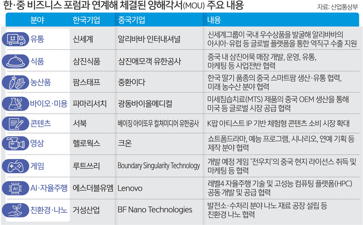 중국 측에서는 대외무역·투자 촉진을 담당하는 준정부기관인 중국무역촉진위원회의 런훙빈 회장을 필두로 중국석유화공그룹 후치쥔 회장, 중국에너지건설그룹 니전 회장, 중국공상은행 랴오린 회장 등 11명이 자리했다. 중국석유화공그룹과 중국에너지건설그룹은 중국 국무원에서 관리하는 대형 국영·국유 기업이다. 아울러 삼성전자 및 LG전자와 액정표시장치(LCD)·유기발광다이오드(OLED) 패널 공급 협력을 맺은 TCL과기그룹의 리둥성 회장과 현대차 및 기아의 일부 전기차에 배터리를 공급하는 협력 관계인 CATL의 정위췬 회장 등도 행사장에서 한국 기업인들과 대화를 나눴다.
