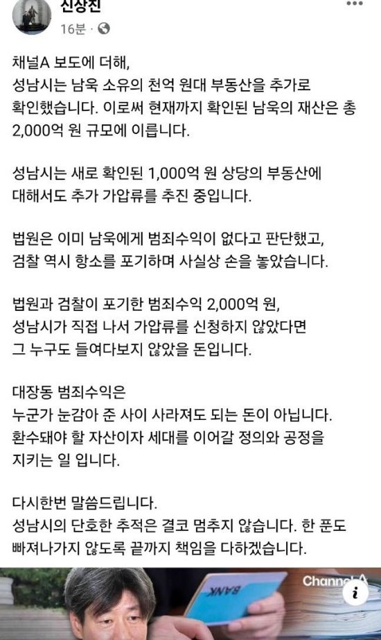 신상진 시장은 SNS 글에서 "법원은 이미 남욱에게 범죄수익이 없다고 판단했고, 검찰 역시 항소를 포기하며 사실상 손을 놓았다"고 지적하며 "성남시는 새로 확인된 남욱 소유의 1000억원 상당의 부동산에 대해서도 추가 가압류를 추진 중"이라고 밝혔다.