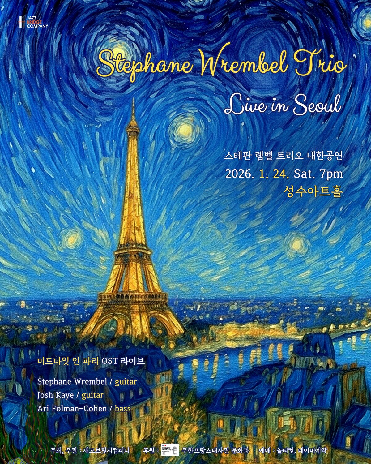영국 런던 출신으로 미국 뉴욕을 기반으로 활동하는 기타리스트 조시 케이, 뉴욕 브루클린 출신 일렉트릭·업라이트 베이시스트 아리 폴먼-코헨이 렘벨과 함께 한다. 이번 공연은 주한프랑스대사관 문화과의 후원을 받아 진행된다.
