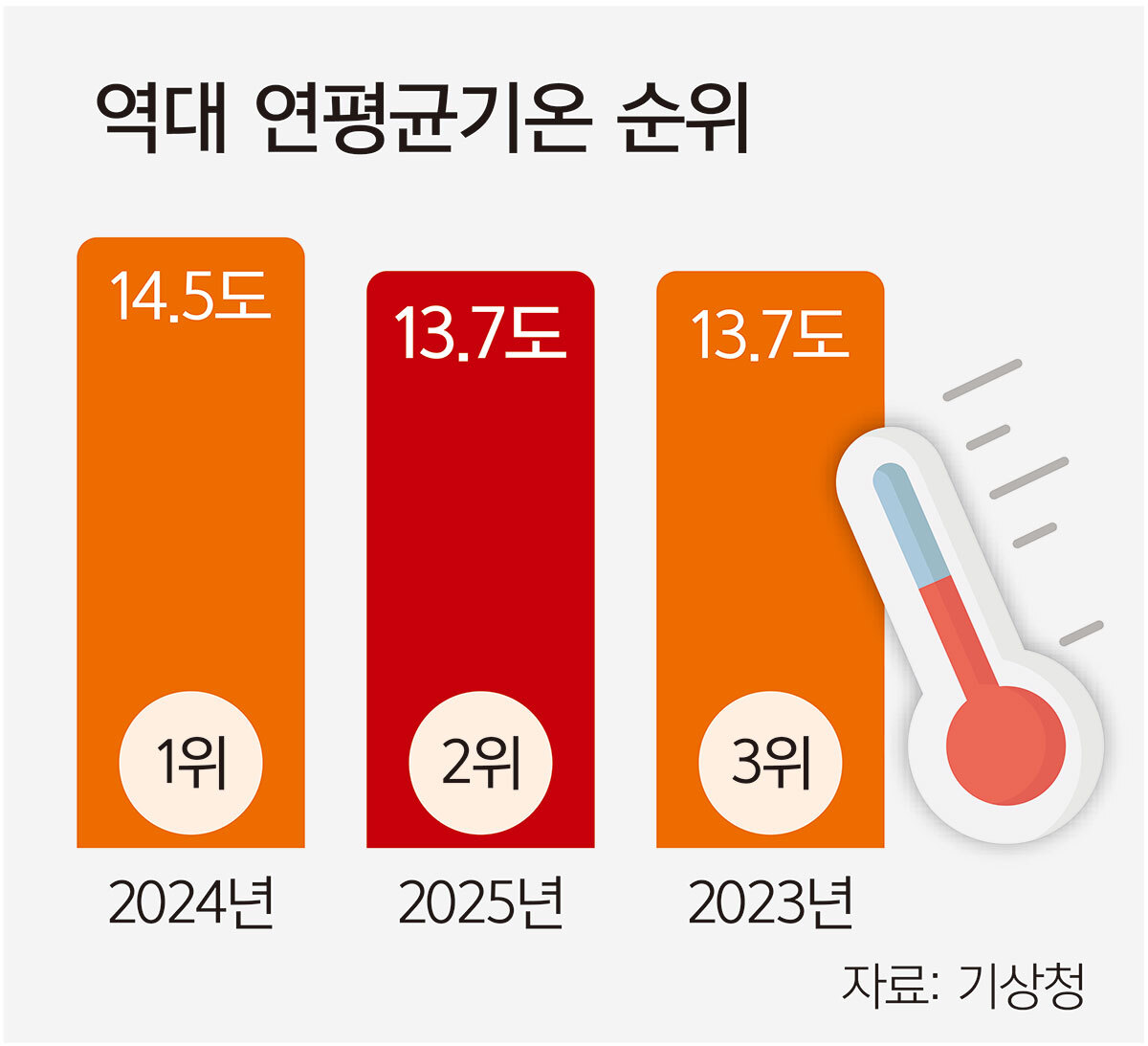 2025년은 우리나라가 역대 두 번째로 더웠던 해로 기록됐다. 연평균기온 기준으로 역대 1∼3위를 기록한 해가 모두 최근 3년이었다. 기후변화 영향 중 하나인 지구 온도 상승이 계속 가속화하는 상황이다.