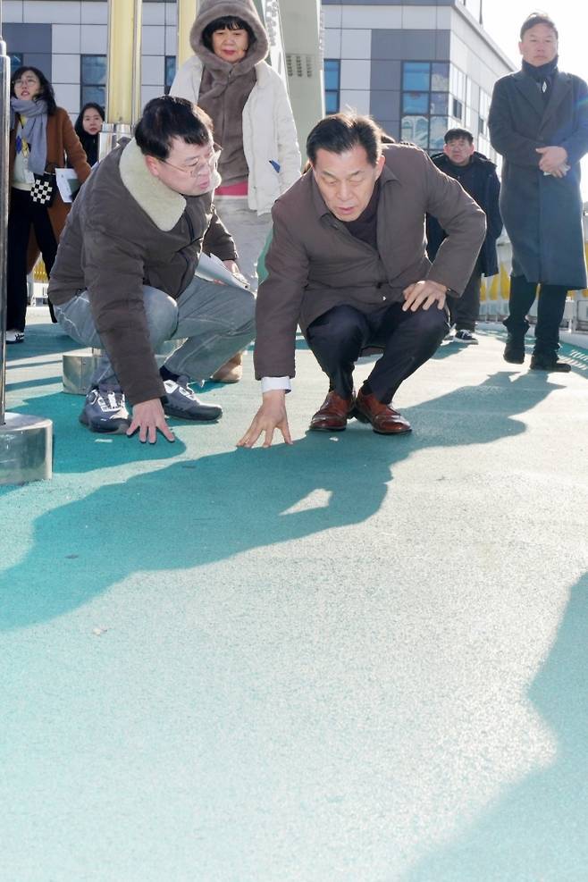 이재준 수원시장 지역 육교를 방문해 안전을 점검하고 있다. 수원시 제공 ―군 공항 이전 후 서수원 부지 개발은. “군 공항 이전에서 지자체 간 갈등이 가장 큰 문제였다. 이는 민원이 아니라 국가전략 차원에서 접근해야 한다. 도심 군 공항이 과연 옳으냐고 설득할 것이다. 이건 국가사업이다. 광주와 대구는 종전부지 개발 이익이 크지 않아 국가 보조를 받아야 하는 처지다. 광주시가 무안에 1조원을 투자하겠다는 이유다. 반면 수원은 개발이익금이 커 국가 지원을 받을 이유가 없다. 수치적으로 3조원 이상의 돈을 이전 예정지에 줄 수 있다. ”