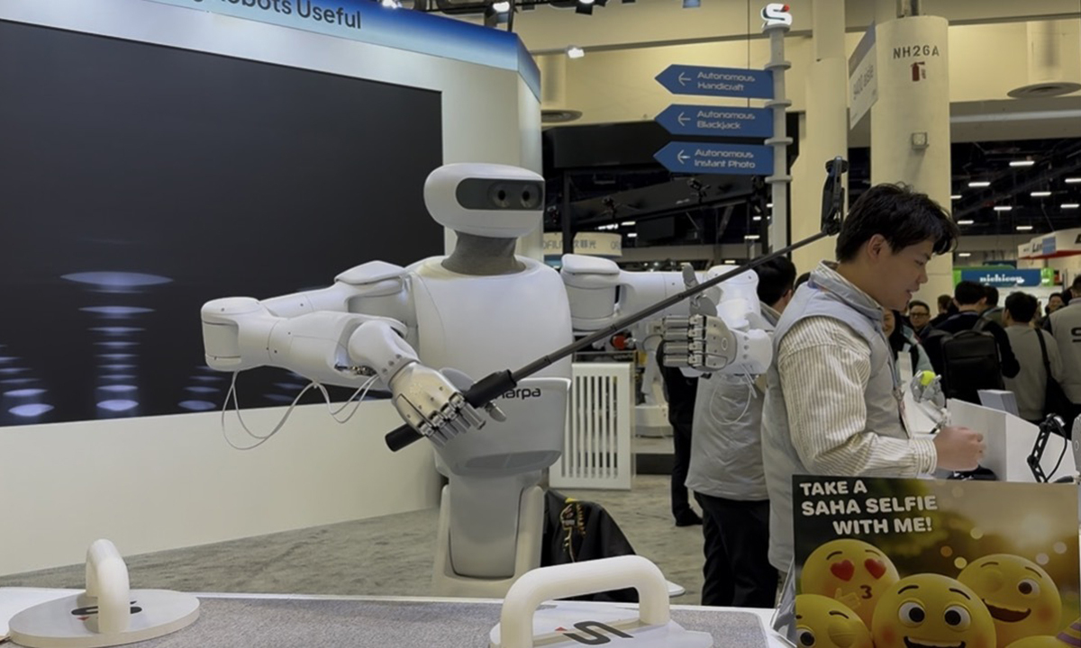 CES 개막일인 6일(현지시간) 미국 네바다주 라스베이거스 컨벤션센터(LVCC) 샤르파 부스에서 샤르파 로봇이 셀카를 찍고 있다. 라스베이거스=유지혜 기자 한국은 산업통상부 주도로 ‘휴머노이드 맥스 얼라이언스’ 공동관을 꾸리고 로봇 전문 기업들을 한데 모아 눈길을 끌었다. 젠슨 황 엔비디아 최고경영자(CEO)의 이번 CES 기조연설 인트로 영상에 등장한 에이로봇의 휴머노이드 ‘앨리스’도 여기서 만날 수 있다. 두 발로 걷는 ‘앨리스4’가 컨베이어 벨트에서 물건을 꺼내 올려두면 바퀴가 달린 ‘앨리스M1’은 이를 다른 선반으로 옮기며 작업 현장을 재현했다. 전날 최초 공개된 현대자동차그룹의 휴머노이드 ‘아틀라스’ 시연에도 발걸음이 쏟아졌다. 전시 첫날임에도 3350명가량이 방문했다. 아틀라스는 한쪽에 쌓인 자동차 부품을 반대쪽으로 옮기는 작업을 시연했는데, 앞서 언급한 로봇들보다 움직임이 훨씬 자연스러웠다.