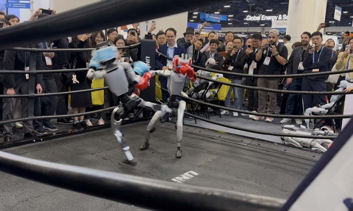 6일(현지시간) 미국 라스베이거스 컨벤션센터(LVCC), 각각 빨간색과 파란색 권투 장갑과 헤드기어를 착용한 두 대의 로봇이 링 위에 올랐다. 먼저 파란색 로봇이 하이킥을 날렸다. 이를 막아낸 빨간색 로봇이 주먹을 뻗으며 거리를 좁혔다. 파란색 로봇이 반격의 펀치를 날리자 빨간색 로봇은 니킥으로 맞받았지만, 파란색 로봇이 연달아 주먹을 날리자 빨간색 로봇은 결국 쓰러졌다. 세리머니를 하듯 파란색 로봇이 두 주먹을 치켜들자 지켜보던 수십명 관람객이 박수를 치며 환호했다.