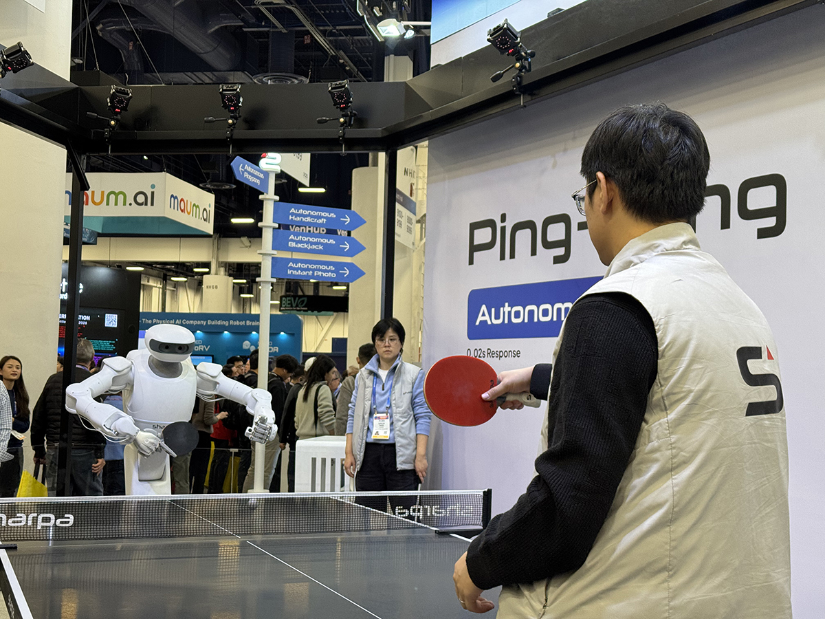 CES 개막일인 6일(현지시간) 미국 네바다주 라스베이거스 컨벤션센터(LVCC) 샤르파 부스에서 샤르파 로봇이 사람과 탁구를 치고 있다. 라스베이거스=유지혜 기자 모빌리티 관련 기업이 모인 LVCC 웨스트홀에서 가장 큰 규모(약 557평)인 현대차그룹 부스에서도 ‘로봇 열풍’을 실감할 수 있었다. 부스 안에서 차량은 전기차 아이오닉5를 기반으로 개발된 로보택시와 주차 로봇 시연을 위한 차량 2대뿐이었고, 대부분 로보틱스 제품과 기술로 꾸며졌다. 라스베이거스=유지혜·이동수 기자