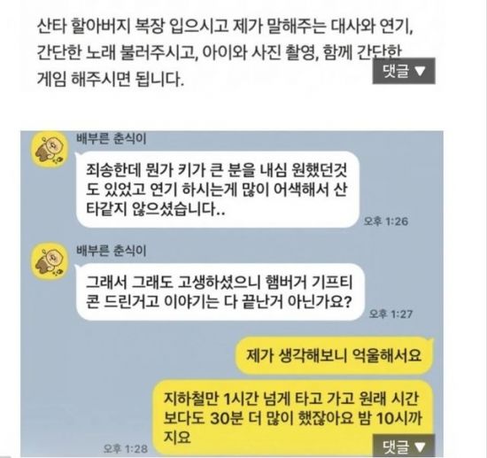 제보자는 "대학 졸업하고 오랫동안 쉬어온 사람인데 뭐라도 해보자는 생각에 당근 알바를 찾았다"며 "크리스마스에 간단한 알바 모집한다길래 지하철 타고 1시간 넘게 이동해 약속된 시간보다 30분이나 더 산타 연기를 했다"고 전했다.