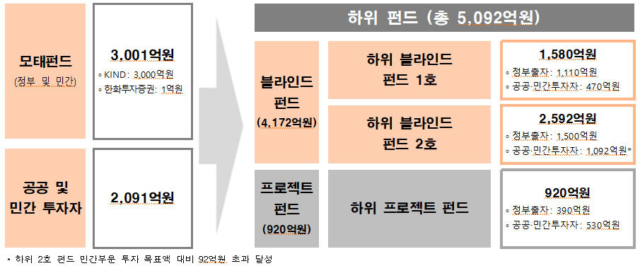 녹색펀드는 지난 2024년 10월 모태펀드가 조성되며 시작됐다. 펀드는 앞으로 2029년까지 정부출자 약 30001억원, 민간투자 약 2091억원을 합쳐 총 5092억원 규모로 조성될 계획이다. 펀드는 크게 하위 블라인드 펀드 1?2호(4172억 원) 및 하위 프로젝트 펀드(920억 원)로 구성돼 각종 해외 신규사업에 투자된다. 하위 블라인드란 미리 결정해 투자하는 대신 운용사의 실력 및 전략 등에 따라 투자하는 방식이다. 녹색 전환 및 에너지 분야에서는 하위 블라인드를 활용하는 경우가 많다.