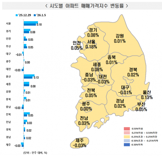8일 한국부동산원이 발표한 1월 첫째 주(5일 기준) 주간 아파트 가격 동향에 따르면 서울 아파트 매매가는 0.18% 올라 직전 주(0.21%) 대비 상승 폭이 축소됐다. 서울 집값은 지난해 2월 첫째 주부터 48주 연속 상승 중이다. 부동산원은 "전반적으로 거래량과 매수 문의가 감소한 가운데 재건축 추진 단지, 대단지·역세권 등 선호 단지 중심으로만 가격 상승이 이어졌다"고 분석했다.