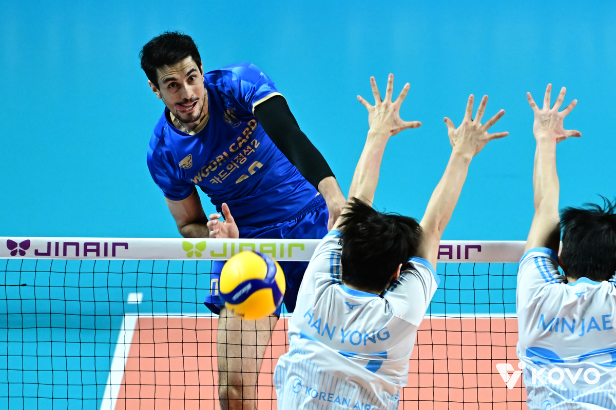 2세트, 우리카드로 분위기가 확 넘어갔다. 세트 초반 서브 범실이 갑자기 쏟아지며 3점 리드를 내주고 출발했지만, 차근차근 따라붙었다. 한태준의 토스 조율 속에 이상현의 속공이 살아났고, 아라우조가 변함없이 고효율 공격을 뿜어냈다. 김지한을 대신해 교체 투입된 한성정이 수비 밸런스를 더하며 15-12, 3점 리드를 빼앗아 오는 저력을 과시했다. 알리의 서브가 또 상대 리시브 라인을 흔들며 경기 3번째 서브 득점을 수놓은 끝에 19-14로 차이를 벌렸다. 이 리드를 그대로 가져간 우리카드가 또 한걸음을 앞섰다.