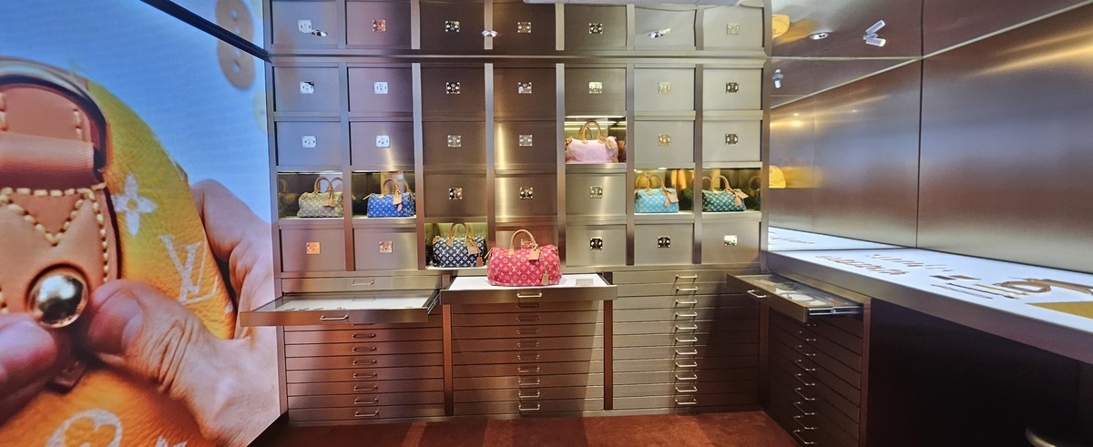 1층 로비 건너편에 마련된 금고를 연상시키는 공간에서는 ‘스피디 P9’ 제품들을 만나볼 수 있다. 박윤희 기자 이어지는 컨시어지 공간에서는 퍼스널라이제이션 서비스를 통해 루이 비통의 장인 정신을 직접 경험할 수 있으며, 로비 건너편에 마련된 금고를 연상시키는 공간에서는 ‘스피디 P9’ 제품들을 만나볼 수 있다. ‘스피디 P9’은 주문 제작 후 받아 볼수 있다. 고객이 원하는 사이즈와 컬러 등을 선택하면 맞춤 제작하는 시스템이다.