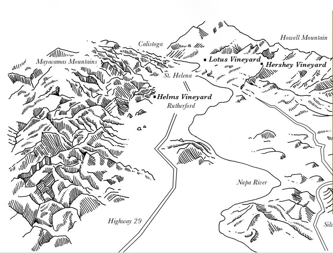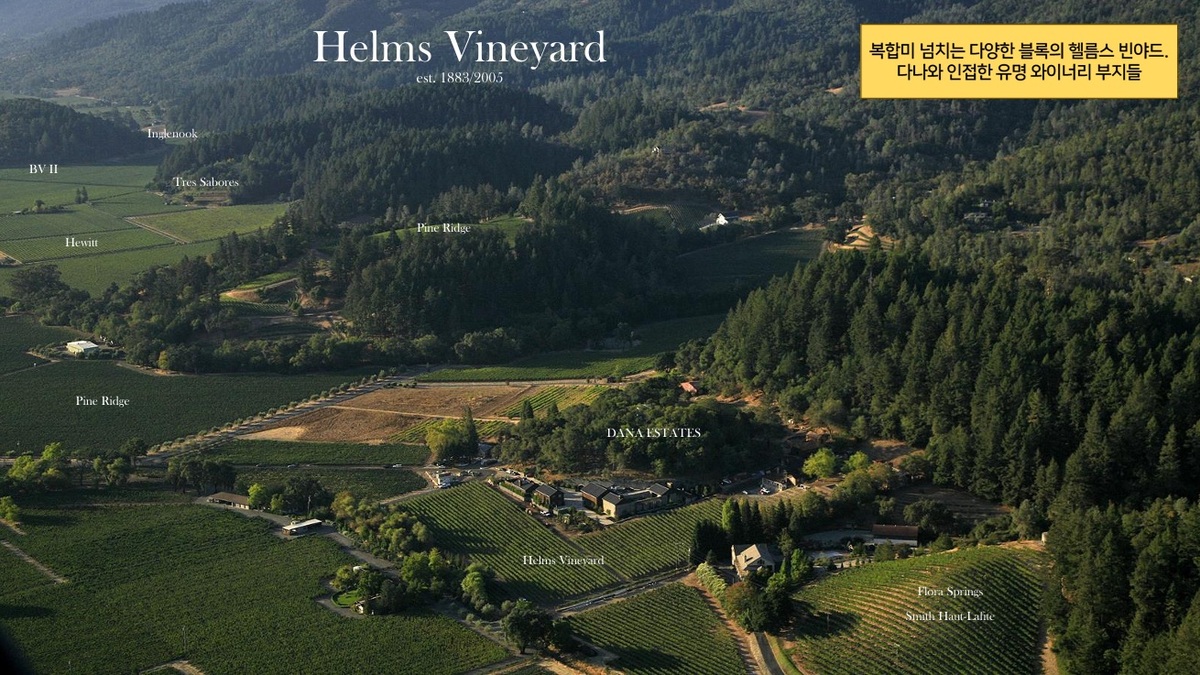 헬름스 빈야드. ▶헬름스 빈야드(Helms Vineyard) 헬름스 빈야드는 마야카마스 산맥의 가장 하단부, 러더포드 지역의 가장 북서쪽 경계에 있습니다. 다나는 2005년 헬름스 빈야드를 매입했고 포도원을 7개 블록으로 나눠 관리합니다. 포도밭은 1940년대에 나파 밸리 카베르네 소비뇽으로 명성을 얻은 잉글눅(Inglenook), 보리유빈야드(Borieu Vinyard), 파인리지(Pine Ridge), 케이크브레드(Cakebread) 와이너리와도 가깝습니다. 헬름스 빈야드는 해발 약 70m의 비교적 낮은 고도이며 토양은 양토와 자갈로 배수가 뛰어납니다. 덕분에 다양한 질감을 지닌 와인 생산 잠재력을 지녔습니다. 계곡의 서쪽이라아침 햇살을 충분히 받고, 오후에는 비교적 온화한 기후의 영향을 받습니다. 이런 조건은 포도의 과숙을 방지하면서도 우아함, 균형감, 잘 다듬어진 구조감을 지닌 와인을 만드는 데 중요한 역할을 합니다.
