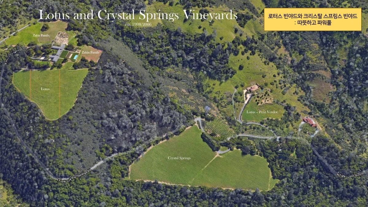 로터스 룸. 홈페이지 ▶로터스 빈야드(Lotus Vineyard) 로터스 빈야드는 하웰 마운틴 바로 아래 해발 약 1200피트(약 360m)에 있으며, 25~40도 급경사입니다. 토양은 무른 콘크리트처럼 단단한 회색 유문암과 균열 있는 기반암이며 배수를 위해 뿌리가 깊게 뻗도록 설계됐습니다. 하루 종일 태양에 노출되는 따뜻한 환경에서 재배돼 깊이 있고 파워풀하며 캐릭터가 뚜렷한 와인을 생산합니다. 평론가들에게 특히 사랑받는 빈야드로 2007년 빈티지 로터스 와인은 다나 에스테이트 최초로 로버트 파커 100점을 획득했습니다.