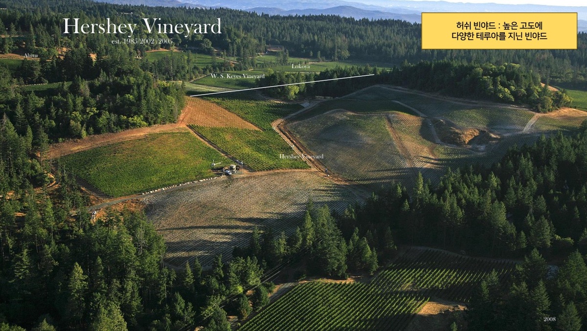 허쉬 빈야드. 홈페이지 ▶허쉬 빈야드(Hershey Vineyard) 허쉬 빈야드는 2006~2007년에 매입했고 총 26개 블록, 약 14ha입니다. 주 품종은 카베르네 소비뇽이며 소량의 카베르네 프랑, 쁘띠 베르도, 메를로, 소비뇽 블랑도 식재돼 있습니다. 굽이치는 작은 언덕들은 하웰 마운틴 능선 부근 해발 약 약 550m에 있습니다. 토양은 구조감이 강하고 깊이가 깊으며, 물을 잘 보유하면서도 배수가 우수합니다. 유문암, 모래재질, 다양한 암석 성분이 혼합된 복합 토양입니다. 소비뇽 블랑은 일반적으로 9월 초에 수확되며, 45~50일 후 카베르네 소비뇽 수확이 이어집니다. 허쉬 빈야드는 다층적이고 구조적인 복합미를 보여주는 것이 특징입니다.