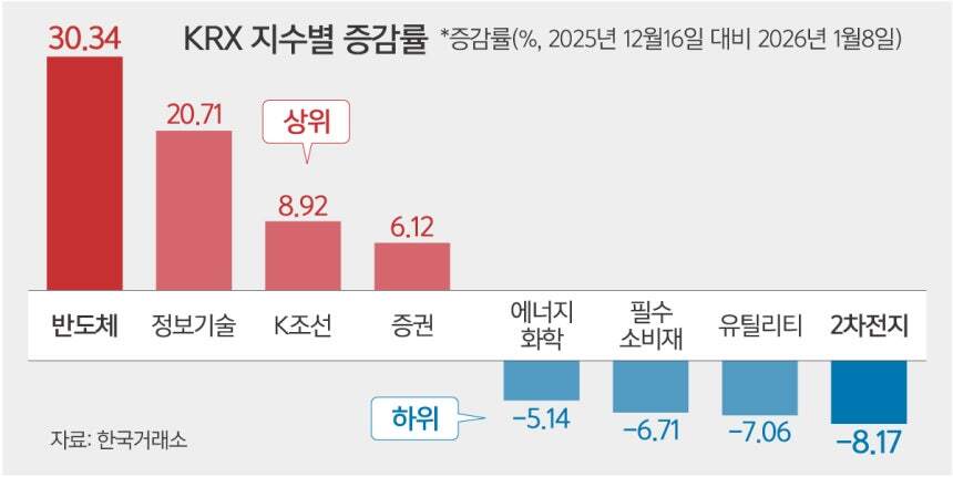 여기에 최근 코스피 훈풍은 반도체주가 일으키고 있다. 지난해 12월 이후 삼성전자와 SK하이닉스, 한미반도체, 원익IPS 등 국내 10대 반도체 제조사가 포함된 KRX반도체 지수는 지난해 12월16일 5656.26에서 이날 7372.28로 장을 마감하며 30.34% 올랐다. 삼성전자와 SK하이닉스가 포함된 정보기술 지수도 같은 기간 20.71%(2384.79→2878.75) 증가해 지수 중 두 번째로 높은 상승세를 보였다.