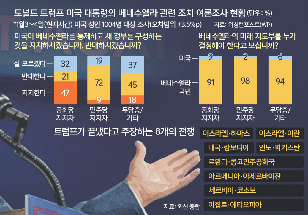 워싱턴포스트(WP)가 지난 3∼4일 미국 성인 1004명을 상대로 실시한 여론조사(오차범위 ±3.5%포인트)를 보면 공화당 지지자 중 미국이 베네수엘라를 통제하고 새 정부를 구성하는 것을 ‘지지한다’고 응답한 비율은 47%로 나타났다. 반면 같은 질문에 ‘반대한다’와 ‘잘 모르겠다’고 답한 비율은 각각 21%, 32%로 집계됐다. 또 베네수엘라의 미래 지도부를 누가 결정해야 한다고 보느냐는 물음에는 공화당 지지자의 91%가 ‘베네수엘라 국민’이라고 응답했다. 이를 두고 미국 정치전문매체 더힐은 “트럼프 대통령 지지자들이 베네수엘라 개입에 대한 지지에 한계가 있음을 보여준다”고 진단했다.