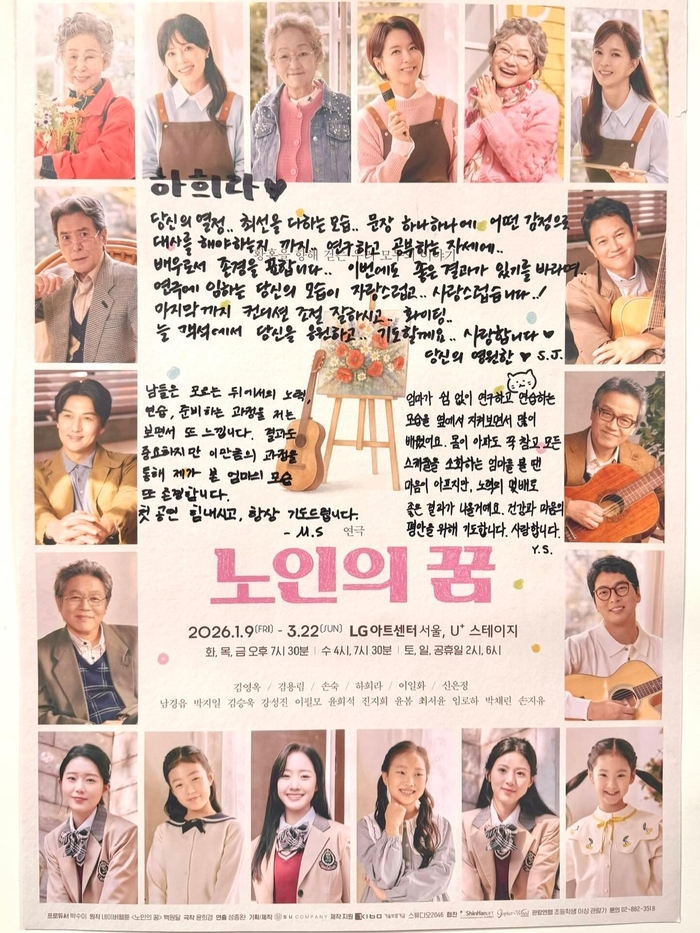 공개된 사진 속에는 연극 ‘노인의 꿈’ 포스터 위로 최수종과 자녀들이 직접 쓴 정성 어린 문구들이 빼곡히 적혀 있다.