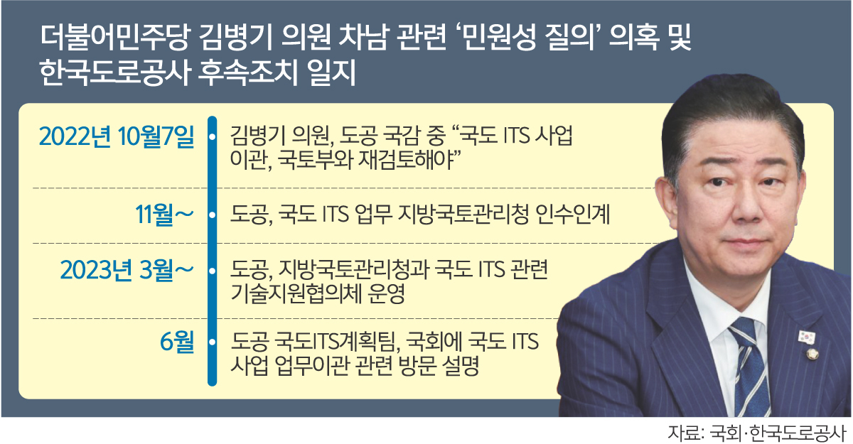 11일 취재를 종합하면 도공은 2023년 6월 국회에 방문해 국도 지능형교통체계(ITS) 사업 업무이관에 대한 설명을 진행했다. 이는 직전 해인 2022년 10월17일 도공 국감에서 김 의원이 질의한 사안에 대한 것이었다.