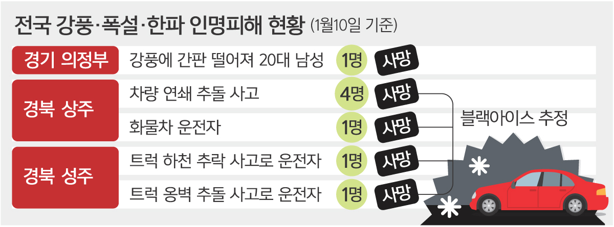 주말 강풍을 동반한 폭설·한파로 전국 곳곳에서 인명 피해가 발생했다. 경북에서는 블랙아이스로 추정되는 대형 교통사고가 발생해 운전자 등 7명이 숨졌다. 경기 의정부에서는 강풍에 간판이 떨어져 행인 1명이 목숨을 잃었다. 지난해 봄 초대형 산불로 잿더미가 된 경북 의성에서는 채 1년도 안 돼 산불이 발생해 주민들이 일시 대피하기도 했다.