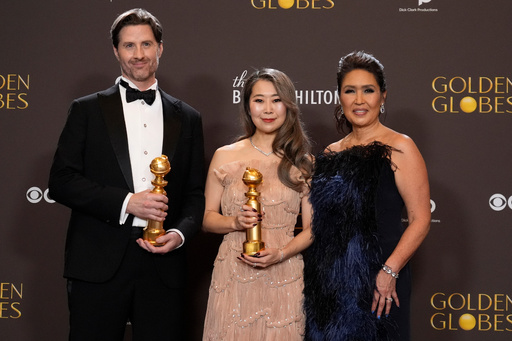 넷플릭스 애니메이션 영화 ‘케이팝 데몬 헌터스’의 공동 연출자 크리스 애펠한스(왼쪽부터)와 매기 강, 프로듀서 미셸 웡이 11일(현지시간) 미국 로스앤젤레스(LA) 베벌리힐튼호텔에서 열린 제83회 골든글로브 시상식에서 애니메이션 작품상을 받은 뒤 트로피를 들고 포즈를 취하고 있다. AP연합뉴스 매기 강 감독은 무대에 올라 트로피를 받아 들고 “이건 정말 무겁다”며 떨리는 목소리로 소감을 전했다.