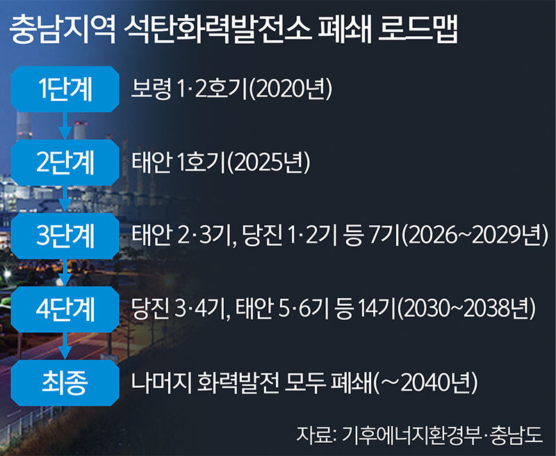 13일 충남도에 따르면 충남에서 처음 석탄화력발전의 불이 꺼진 것은 2020년 보령화력 1·2호기였다. 지난 연말 태안화력 1호기 발전 종료를 기점으로 충남의 석탄화력 퇴출이 본격화되고 있다. 지금까지 충남지역엔 31기의 석탄화력발전소가 건설됐으며 이 중 3기가 가동을 멈췄다. 이재명정부는 남아 있는 28기 가운데 21기는 2038년까지, 나머지 7기도 2040년까지 순차적으로 퇴역시킬 예정이다.