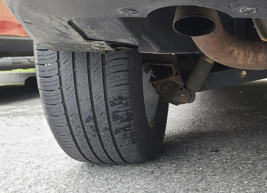 리어 멤버가 부식돼 뒷바퀴가 심하게 뒤틀린 QM6 차량. 사진=제보자 제공 르노코리아의 스포츠유틸리티차(SUV) QM6에서 심각한 부식이 발생해 안전에 큰 위협이 되는 것으로 전해졌다.