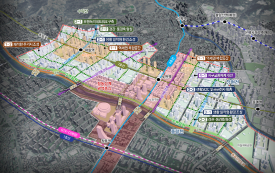 먼저 용도지역 상향을 통한 역세권 중심의 복합개발로 사업성을 높이고 자족기능을 강화하기 위해 '복합정비' 개념을 도입한다. 복합정비구역 지정을 통해 역세권에서는 주거 외 복합용도를 갖춰 일자리와 주거·문화가 어우러지는 고밀 복합개발이 가능해지는 것이다. 역세권 활성화를 위해 지하철 출입구 연결, 가로 활성화 유도 등 역세권을 중심으로 한 복합공간을 조성할 수 있도록 유도한다.