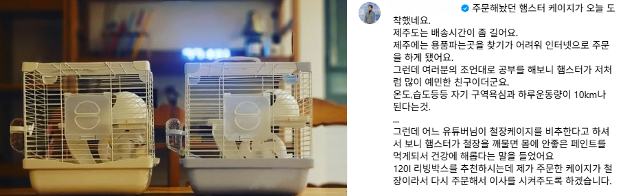 이어 SNS를 통해 자신의 짧았던 지식으로 인한 무지를 사과했고, “햄스터에 대해 많이 공부했다. 현재 바꿔준 케이지도 햄스터에게 좋지 않다고 해 다시 주문했다. 제주도라서 배송이 느려 기다리는 중이다”라고 전하며 적극적으로 피드백을 수긍하는 모습을 보였다.