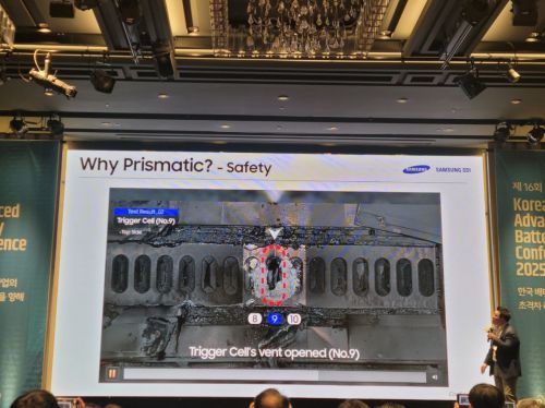 특히 각형 배터리는 배터리 내에 이상 가스가 발생하면 외부로 배출할 수 있는 벤트(vent)를 설치할 수 있기 때문에 화재 안전성이 뛰어나다는 장점이 있다. 김 그룹장은 열폭주가 발생하지 않는 노(No)-TP(thermal propagation) 기술을 개발했다고 설명했다.