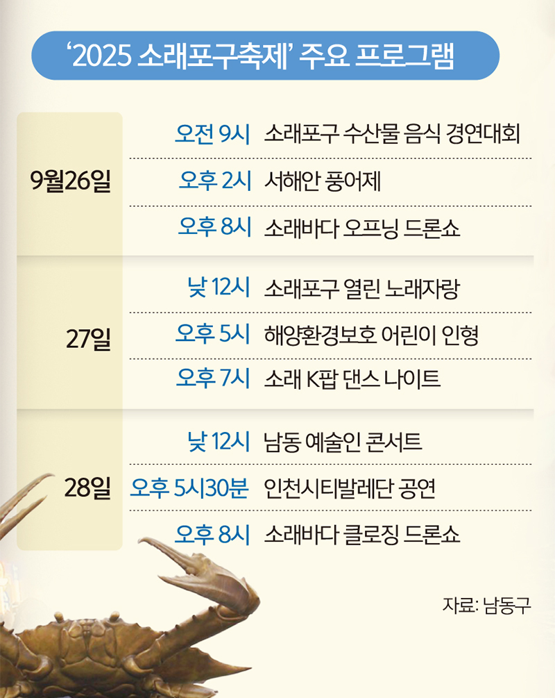 구는 모두가 안전하고 편한 축제의 장이 될 수 있도록 만반의 준비를 마쳤다. 현장에는 샤워실, 탈의실, 응급의료실, 휠체어 대여소 등 편의시설을 확충했고, 교통 통제와 안전 요원 배치도 철저하게 이뤄진다. 남동구 관계자는 “소래포구만의 특색이 담긴 차별화된 콘텐츠로 바다의 낭만과 즐거움을 선사하겠다”며 “우리나라를 대표하는 문화관광축제로 자리매김할 수 있도록 최선을 다할 것”이라고 말했다.