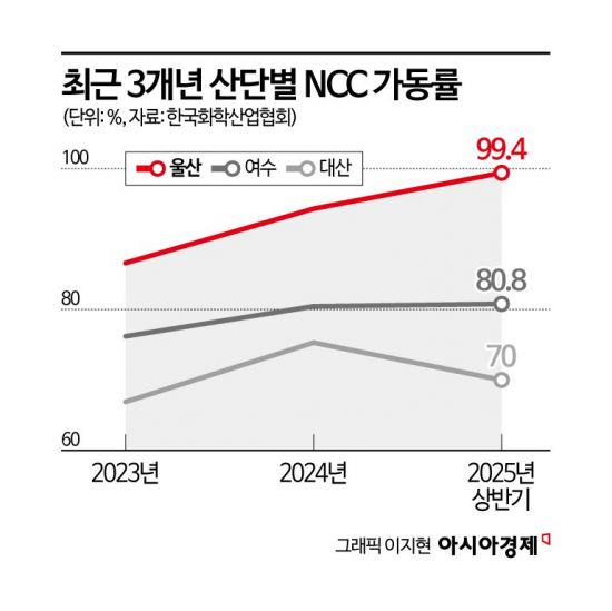 울산석화단지의 가장 큰 불만은 전남 여수, 충남 대산을 포함한 3개 석화단지 가운데 가동률이 가장 높다는 점에서 드러난다. 올해 상반기 기준 SK지오센트릭은 100%, 대한유화는 95% 이상이다. 생산되는 에틸렌은 모두 다운스트림(합성수지·고무 등 후방공정) 가동에 투입되고 있다. 한국화학산업협회에 따르면 최근 3년간 NCC 가동률은 대산이 70.0%, 여수는 80% 정도로 업계 손익분기점인 85%를 밑돌았다. 반면 울산은 같은 기간 90% 이상을 기록하고 있다. SK지오센트릭 관계자는 "NCC만 떼어놓으면 적자지만 수직계열화 설비를 바탕으로 다운스트림 수요에 맞춰 최적화했다"고 말했다.