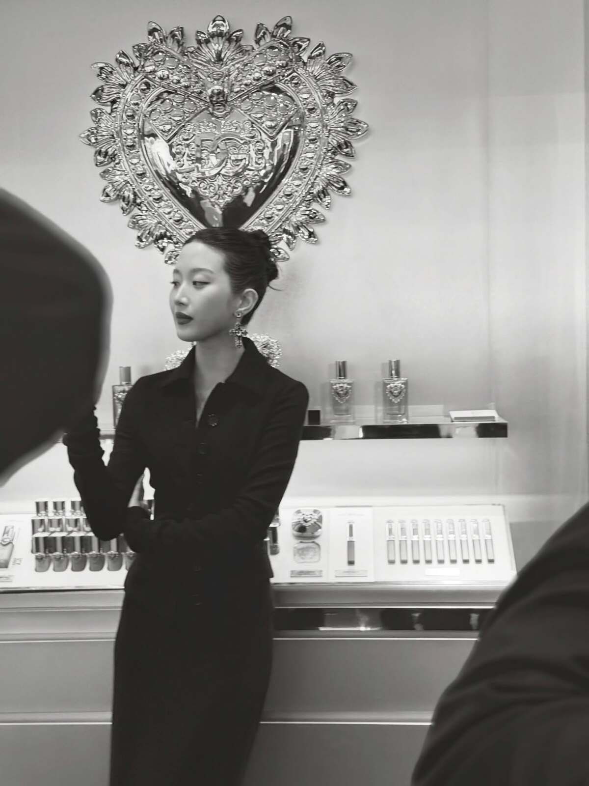 이날 문가영은 자신이 앰배서더로 활약하고 있는 명품 브랜드의 란제리 슬립을 완벽하게 소화해낸 모습이었다. 화려한 레이스 장식의 검정색 슬립으로 복부 부분에 시스루로 장식된 것이 포인트였다.