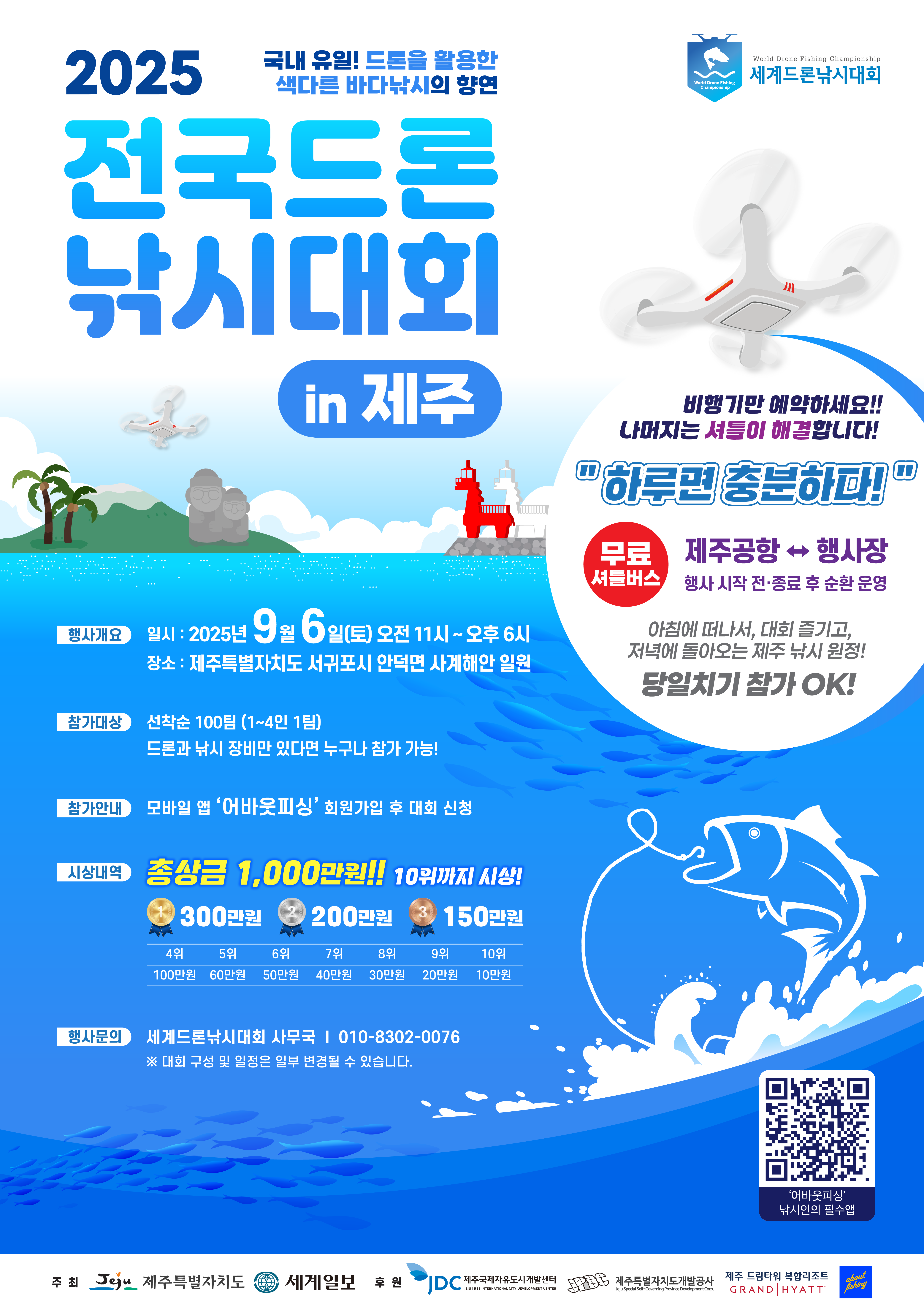 세계일보 주최로 2025년 4월 19일 충남 당진드론산업지원센터 앞 석문방조제 일원에서 제8회 세계드론낚시대회가 열린 가운데 참가자들이 드론 낚시를 하고 있다. 세계일보 자료사진 제주에서는 처음 열리는 드론낚시대회는 대한민국 최남단 마라도와 가파도, 형제섬이 코 앞인 안덕면 사계리 해안도로변 올레길 10코스 해안 황금빛 모래사장에서 열린다. 드론을 활용한 낚시채비의 원거리 투척방식으로 승부를 겨룬다. 드론에 미끼를 단 낚싯줄을 매달아 바다에 넣고 낚시한다. 기본 규칙은 드론을 이용해 낚싯줄을 20m 이상 날려보내 바다에 떨어뜨리고, 정해진 시간에 최대한 많은 고기를 잡는 것이다. 총 상금 1000만원 규모로, 시상 외 지역 특산품 등 다양한 경품 추첨도 진행한다. 관람객들은 새로운 드론 레저스포츠를 직접 즐길 수 있다. 과학 크리에이터 ‘궤도’와 드론촬영 권위자인 임완호 감독의 특별 강연도 마련돼 청소년과 가족 참가자들에게 우주항공 산업의 매력을 쉽고 생생하게 전달한다.