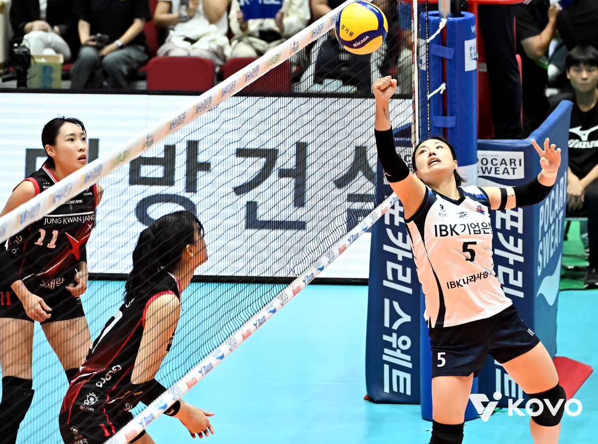 프로 10년차의 구력을 제대로 실감할 수 있는 한 판이었다. IBK기업은행의 10년차 세터 김하경이 ‘하드캐리’로 역전승을 이끌었다. IBK기업은행은 22일 여수 진남체육관에서 열린 2025 여수·NH농협컵 프로배구대회 여자부 B조 조별리그 1차전에서 정관장에 세트스코어 3-1(16-25 25-20 25-22 25-20) 역전승을 낚았다.