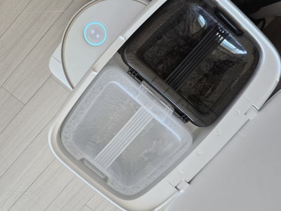 설정을 완료한 후 스테이션 내부에 있는 물통에 물을 채웠다. 그 다음 본체의 전원 버튼을 켜니 베이스 스테이션에서 물걸레를 자동 세척하는 기능이 작동됐다. 스테이션 내부에는 240㎖ 용량의 물통이 두 개가 탑재돼 있는데 한쪽에는 깨끗한 물을 채우고, 다른 한통에는 청소 후 차오르는 오수를 가끔씩 비워내기만 하면 됐다. 로봇청소기가 집 안을 청소하며 돌아다니다가 가끔씩 스테이션에 넣고 재충전과 세척을 자동으로 할 수 있어서 편리했다.