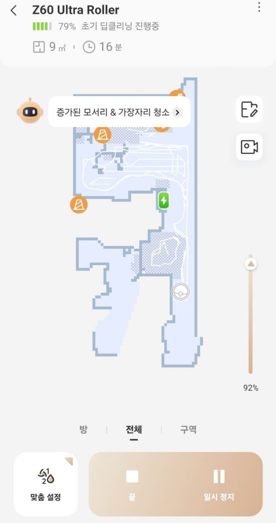로봇청소기를 사용하는 가장 큰 장점은 평소 귀찮게만 느껴지는 바닥 물걸레 청소를 수시로 대신해준다는 것이다. 청소 구역과 순서만 설정해두면 알아서 돌아다니면서 먼지 청소와 물걸레 청소를 해주었다. 바닥에 되직한 요거트를 흘려봤더니 Z60 울트라 롤러가 여러번 왔다갔다 하면서 모두 닦아냈다.