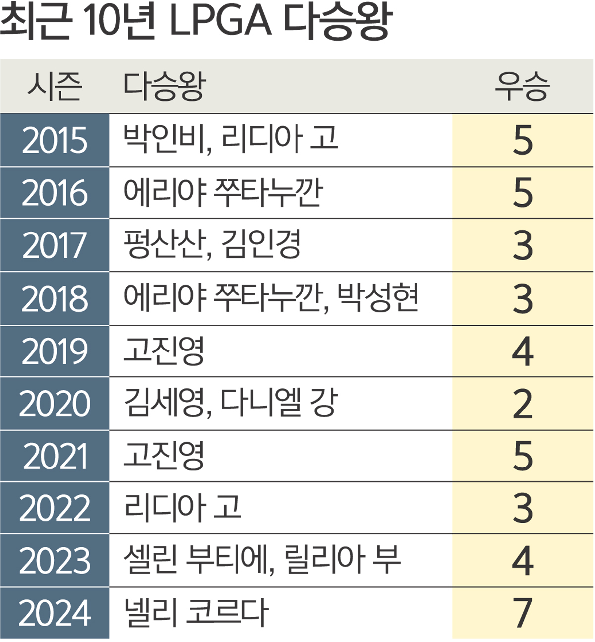 FM 챔피언십이 왕의 우승으로 막을 내리면서 LPGA는 35개 일정 중 23개 대회를 마쳤다. 하지만 눈에 띄는 강자가 보이지 않는다. 2인 1조로 경기해 우승자가 2명인 다우 챔피언십을 포함하면 올 시즌 우승자는 모두 24명에 달한다. 이들은 올 시즌 남은 12개 대회에서 우승을 놓고 경쟁하고 있다. 이는 지난 시즌 넬리 코르다(27·미국)가 7승을 거둔 것과 크게 비교된다. 역대 최소승 다승왕이 탄생할 가능성도 커지고 있다. 골프 데이터 업체인 골프 컨페디움에 따르면 역대 LPGA 투어에서 최소승으로 다승왕을 차지한 건 신종 코로나바이러스 감염증(코로나19)이 만연했던 2020년 2승이다. 당시 LPGA는 예정된 33개 대회 가운데 16개 대회만 열렸고 두 차례씩 우승을 차지한 김세영과 다니엘 강(33·미국)이 공동 다승왕에 올랐다.