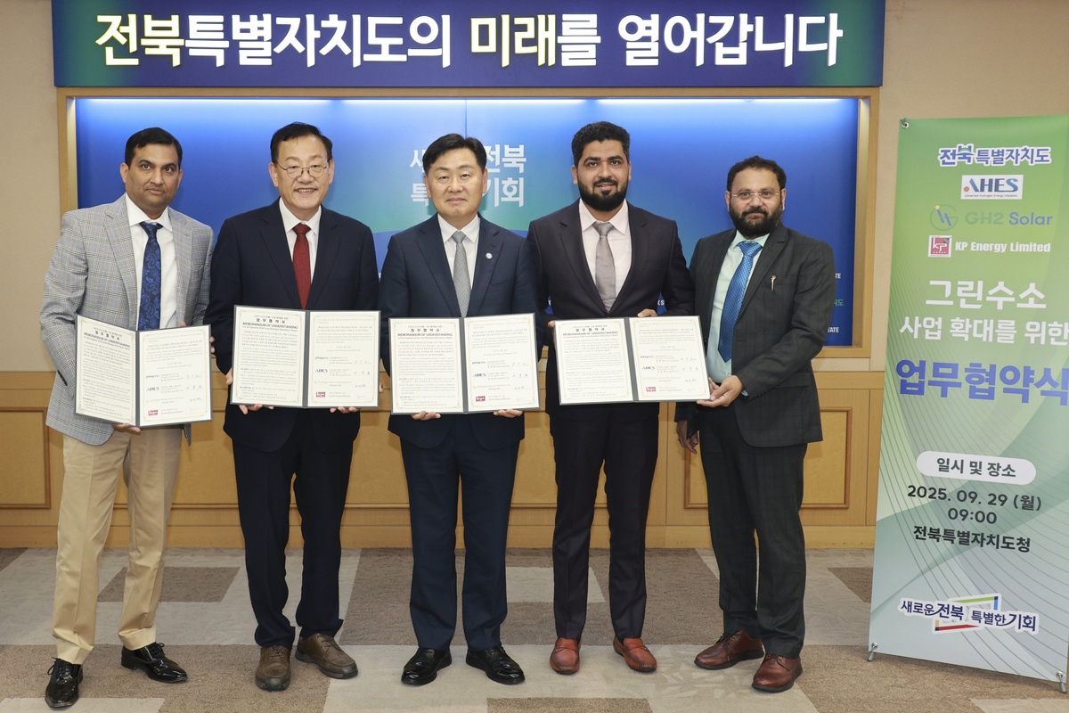 전북도청에서 열린 인도 에너지 기업 그린수소 사업 확대를 위한 업무 협약식에서 김관영 전북도지사(가운데)와 아누라그 자인 GH2 Solar 대표, 이중희 ㈜아헤스 대표, 로비 라자세카람 KPI Green Hydrogen & Ammonia 사장, 모이눌 KP Group 사장겸 전임이사가 협약서를 들어보이고 있다. 전북도 제공 전북도는 29일 도내 수소 전문기업 ㈜아헤스와 함께 인도 GH2 Solar, KPI Green Hydrogen & Ammonia와 업무협약(MOU)을 체결했다고 밝혔다. 협약에 따라 전북도와 참여 기업들은 수전해 설비 기술 교류와 그린수소 분야 공동 사업 추진, 인도 현지 시장 확대에 상호 협력하기로 했다. 전북도는 이번 협약을 계기로 국제 공동 프로젝트와 해외 판로 개척을 적극 지원해 도내 기업의 기술 경쟁력을 높이고, 청년·연구 인력의 일자리 창출을 유도한다는 계획이다. 알칼라인 수전해 스택 전문 기업인 ㈜아헤스는 지난해 GH2 Solar와 5년간 3765억원 규모의 수출 계약을 체결한 데 이어 최근 20억원 규모의 실질 성과를 올리며 인도 시장 진출을 본격화했다. GH2 Solar는 태양광 설계·조달·시공(EPC)과 그린수소, 에너지저장시스템 사업을 주력으로 하며, 지난해 인도 에너지공사(SECI)의 525㎿ 수전해 프로젝트 수주 실적을 보유하고 있다. KP Group은 인도 구자라트에 본사를 둔 에너지·인프라 기업으로, 7.26㎿ 규모의 재생에너지 발전 용량을 확보한 글로벌 자회사 KPI Green Hydrogen & Ammonia를 통해 수전해 기반 그린수소와 암모니아 생산 사업을 추진 중이다.