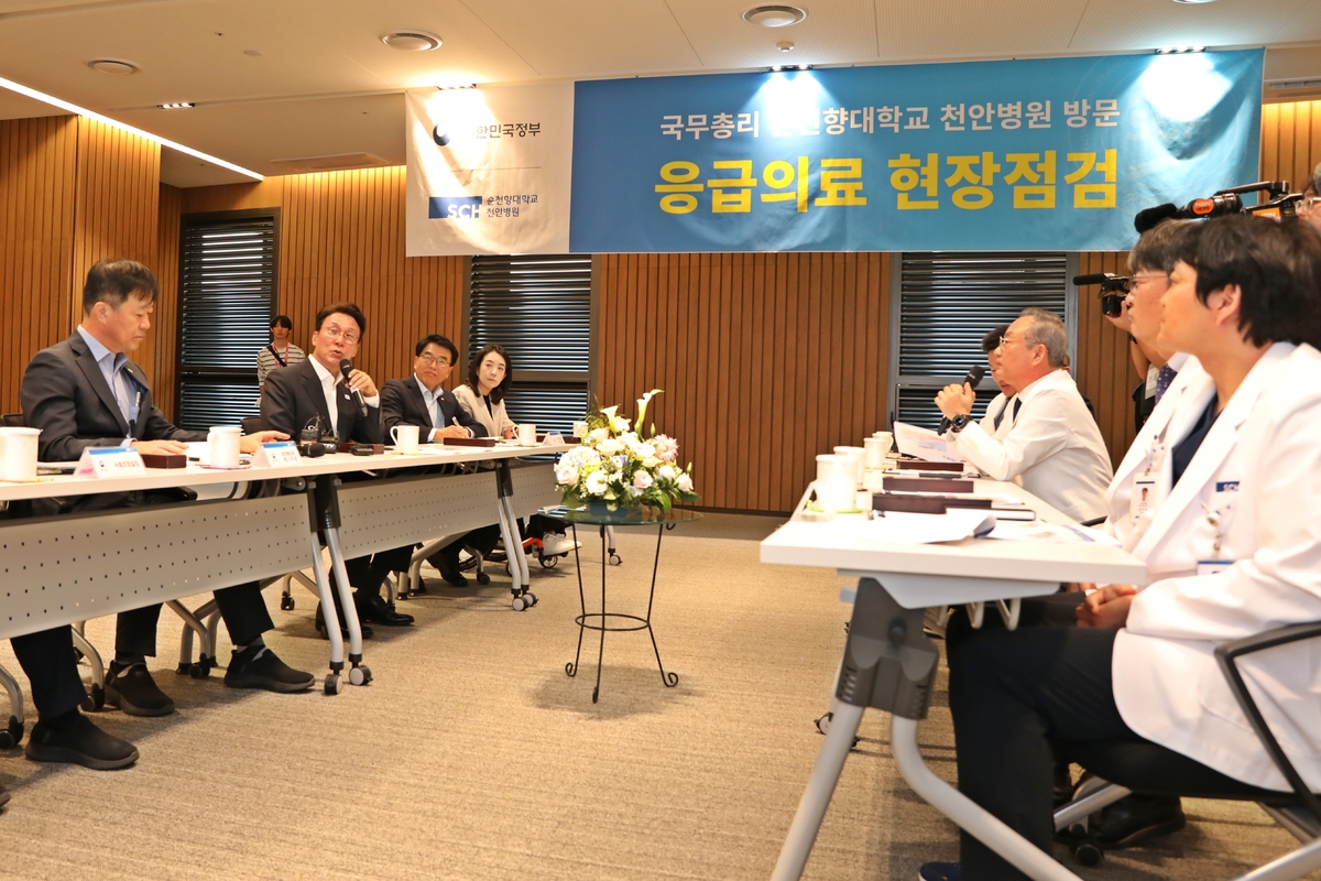 김민석(왼쪽 두번째)국무총리가 1일 순천향대천안병원에서 이문수(오른쪽 첫번째)순천향대 천안병원장과 응급의료운영쳬계에 대한 질의응답식 현장 점검을 실시했다. 정부는 같은날 보건복지부는 중앙재난안전본부 1차장인 정은경 보건복지부장관 주재로 '의사 집단행동 중앙재난안전대책본부' 제116차 회의를 개최하고 추석 연휴 대비 응급의료체계 유지 특별대책을 발표했다. 발표한 특별대책에 따르면 정부는 413개 응급의료기관, 17개 권역외상센터 등 응급의료체계를 빈틈없이 운영하는 비상진료체계는 계속 유지하면서 가까운 곳에서 병·의원을 이용할 수 있도록 문 여는 병?의원 및 약국에 대해서도 지원을 강화한다.