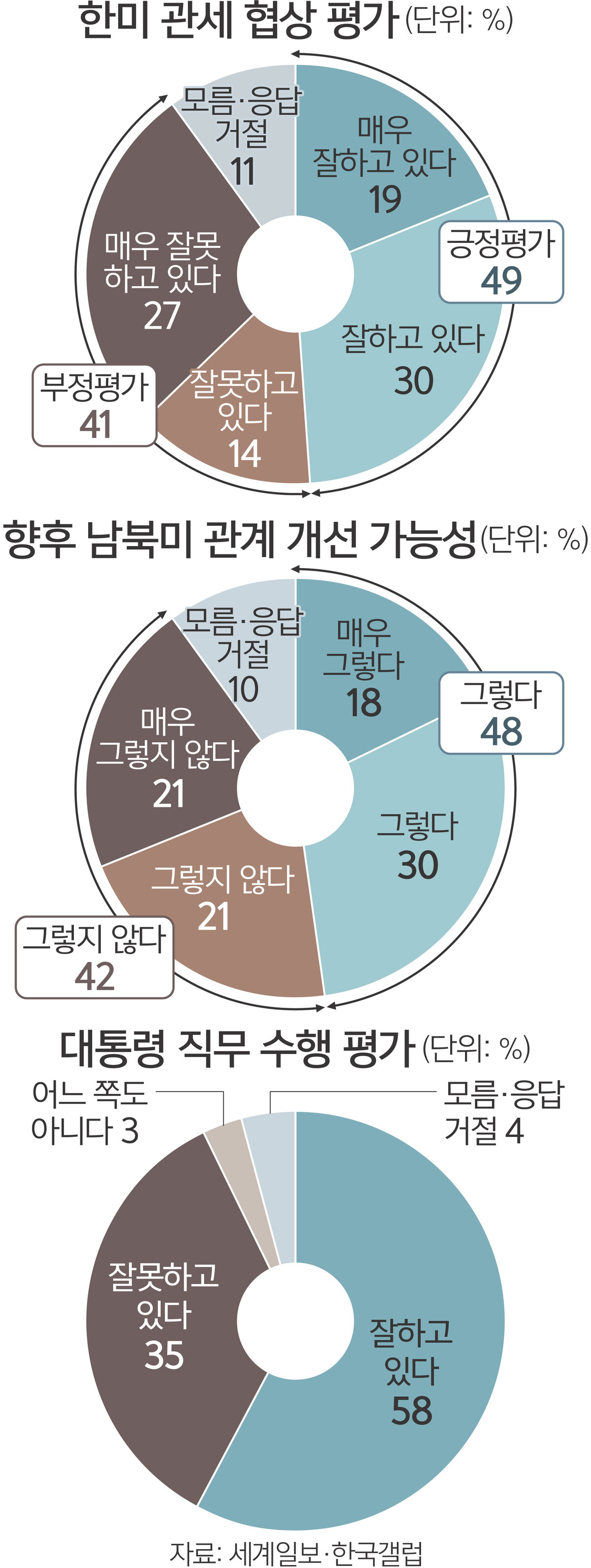 한국 정부의 대미 관세 협상이 진통을 겪고 있는 가운데, 우리 국민의 절반 가까이는 정부가 관세 협상을 잘하고 있다고 판단하는 것으로 나타났다. 한반도 평화를 위해 도널드 트럼프 미국 대통령이 북·미 대화 등을 주도하며 ‘피스메이커’ 역할을 맡고, 이재명 대통령과 한국 정부는 이를 지원하는 ‘페이스메이커’를 역할을 하는 대북 전략 구상에 대해서도 국민 절반은 성과를 기대하는 모습이었다.