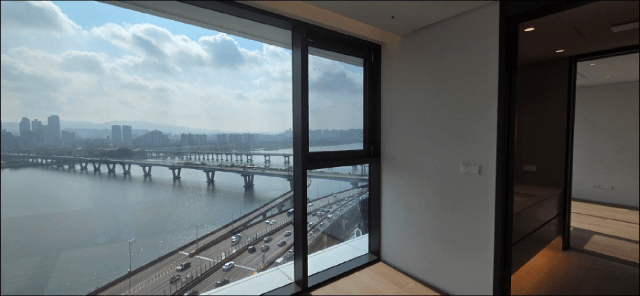 한 세대의 현관문을 열고 들어서자 거실 통창 너머로 파노라마처럼 펼쳐진 한강이 시야를 압도했다. 약 2.72m에 달하는 높은 천장고와 투명한 커튼월창은 마치 한강 위에 떠 있는 크루즈선에 오른 듯한 착각을 불러일으켰다. 인근 워커힐 호텔보다 한강에 더 가깝고 막힘없는 시야를 제공한다는 설명은 과장이 아니었다. 특히 거실뿐만 아니라 각각의 방도 커튼월로 설계된 구조여서 집안 곳곳에서 뻥 뚫린 한강뷰를 즐길 수 있었다. '하이퍼 럭셔리'라는 수식어에 걸맞게 독일 명품 주방가구 '지메틱', '가게나우' 가전 등으로 채워진 것도 눈길을 끌었다.