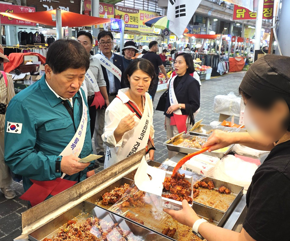 홍성현(왼쪽) 충남도의회 의장이 2일 천안중앙시장에서 장을 보면서 전통시장 활성화에 노력하겠는 뜻을 밝히고 상인들과 이야기를 나눴다. 이날 김 지사는 각 시장을 찾은 자리에서 전통시장 활성화를 위한 도 차원의 지원책을 발굴·추진하고 민생경제 안정을 위해 행정력을 집중하겠다는 뜻을 전했다. 충남도는 도내 전통시장을 대상으로 폐회로텔레비전(CCTV) 설치·화장실 개선 등 시설 현대화 지원사업, 화재 공제 지원·온라인 전자상거래 활성화 등 경영 현대화 지원사업을 추진하고 있다.
