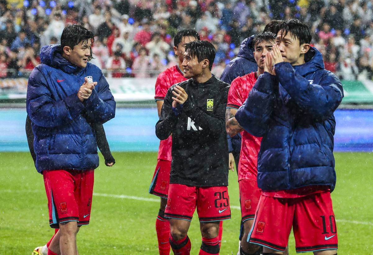 대표팀이 10일 서울 마포구 서울월드컵경기장에서 열린 브라질과의 10월 A매치를 마친 뒤 관중들에게 인사를 하고 있다. 사진=뉴시스 “친구와 함께 같이 계속해서 오랜 시간을 뛰고 싶은 게 가장 큰 꿈이죠.”