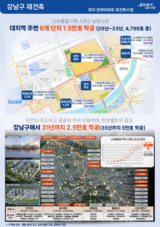 은마아파트는 정비사업 기간을 12년으로 단축하는 '신속통합기획 2'를 적용한 첫 단지다. 신통기획 2는 정비사업 소요 기간을 정비구역 지정까지 2년, 착공까지 6년, 준공까지 4년으로 잡고, 단계별 처리기한제 등을 통해 정비사업 속도를 단축하는 공공지원계획을 말한다. 시는 2031년까지 강남구에 2만5000가구, 서울 전역에 31만가구를 착공한다. 강남권을 비롯한 여의도, 목동, 성수 등 주요 지역의 정비사업 속도도 높인다.